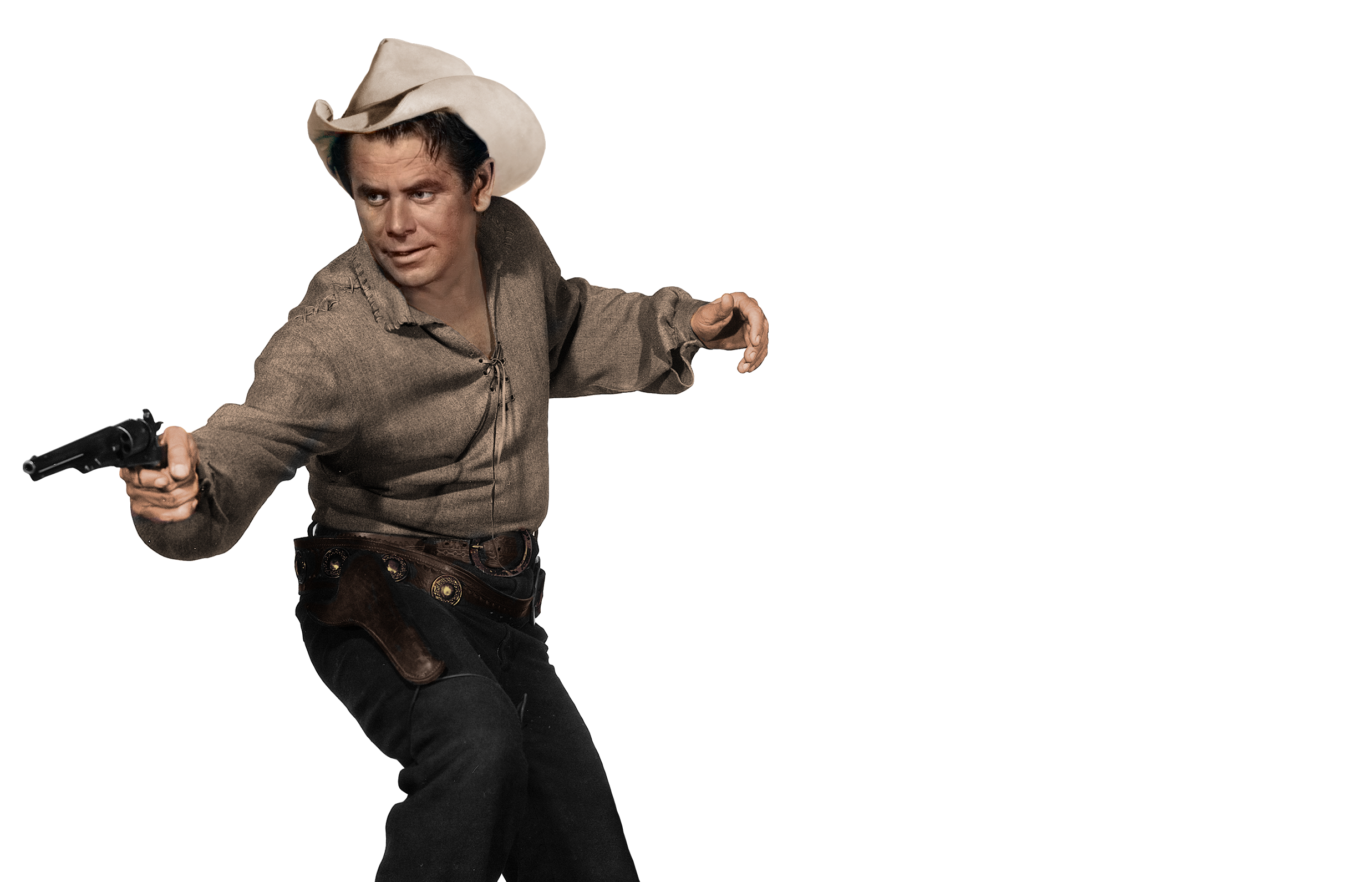 Post-war, Ford’s star rose quickly. He became a box office favorite in the late 1940s and ’50s, known for his work in Gilda, The Big Heat, The Blackboard Jungle, and 3:10 to Yuma. His ability to shift between genres made him a standout—equally at home in noir thrillers, romantic comedies, and Westerns. His Western credits include The Fastest Gun Alive, The Desperados, Cowboy, and Heaven with a Gun, where he often played principled men navigating moral gray areas.