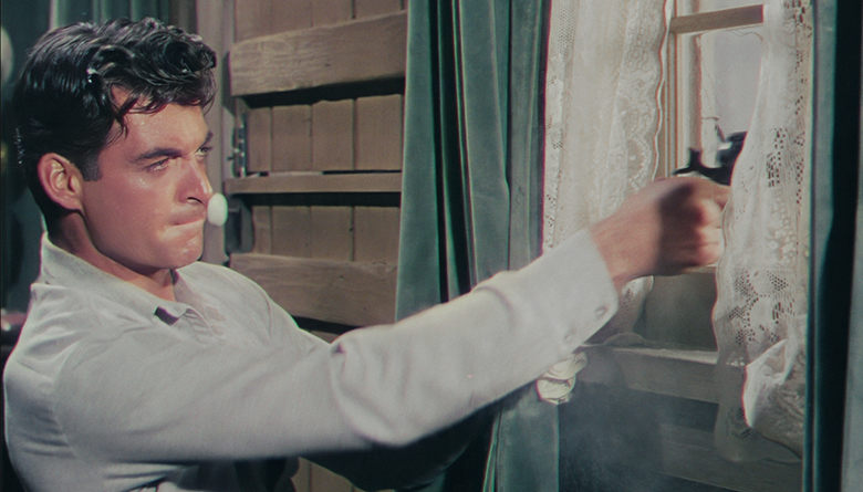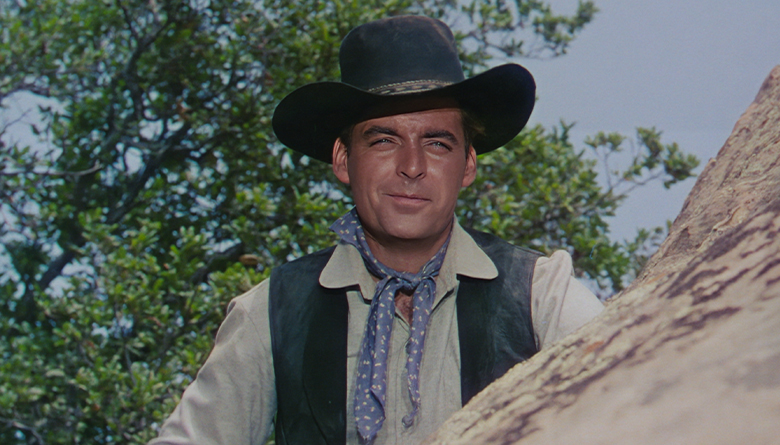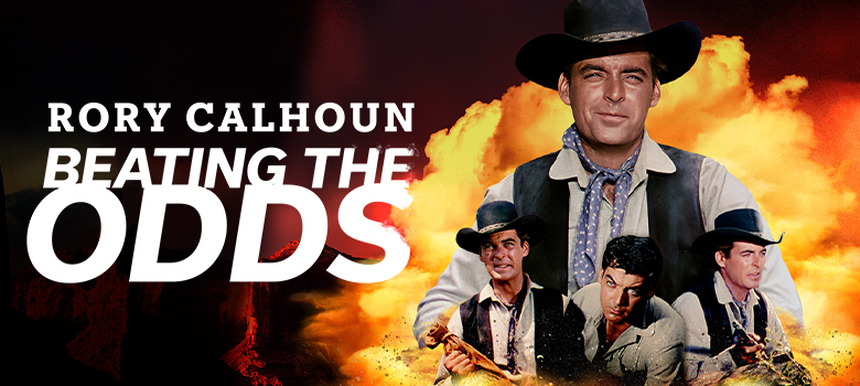 Considering Rory Calhoun’s film career—over a hundred dynamic film and TV roles, including 33 Western movies and his series, The Texan—it’s remarkable how little his work is known today. But Rory, who died in 1999, has slipped through the cracks. Like George Montgomery and Guy Madison—incidentally, Rory’s closest friend—his fine work hasn’t yet been rediscovered by new Western fans. That’s because he didn’t work for Ford or Hawks, didn’t co-star with John Wayne or Randolph Scott. And there is no “must-see” movie like Stagecoach on his resumé. Ironically, in his best-known Western, he’s a villain. In The River of No Return, he’s magnetic as Marilyn Monroe’s smiling cobra of a boyfriend, in a life-and-death struggle with Robert Mitchum.